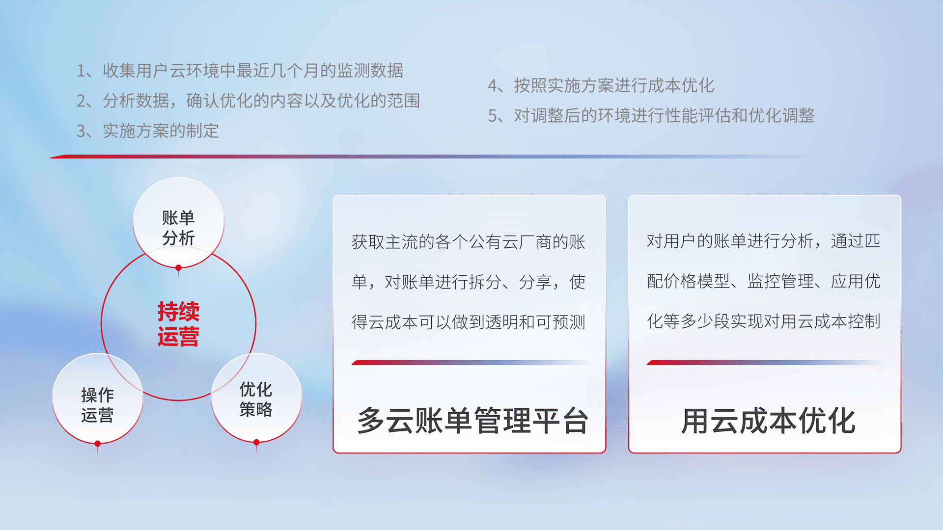 通过多云纳管,,,,以统一的资源数据模型把客户的云资源进行抽象和封装,,,,进而实现对多云资源的统一操作,,,保障云资源管理的可靠性、、、、稳定性与可用性。。。。量身定制化运维内容,,,配置、、、开发运维、、、、补丁管理、、、备份、、、监控、、、认证和访问管理、、审计和日常巡检等,,,保障在用云过程中的可靠度,,,稳定度以及高可用率。。。