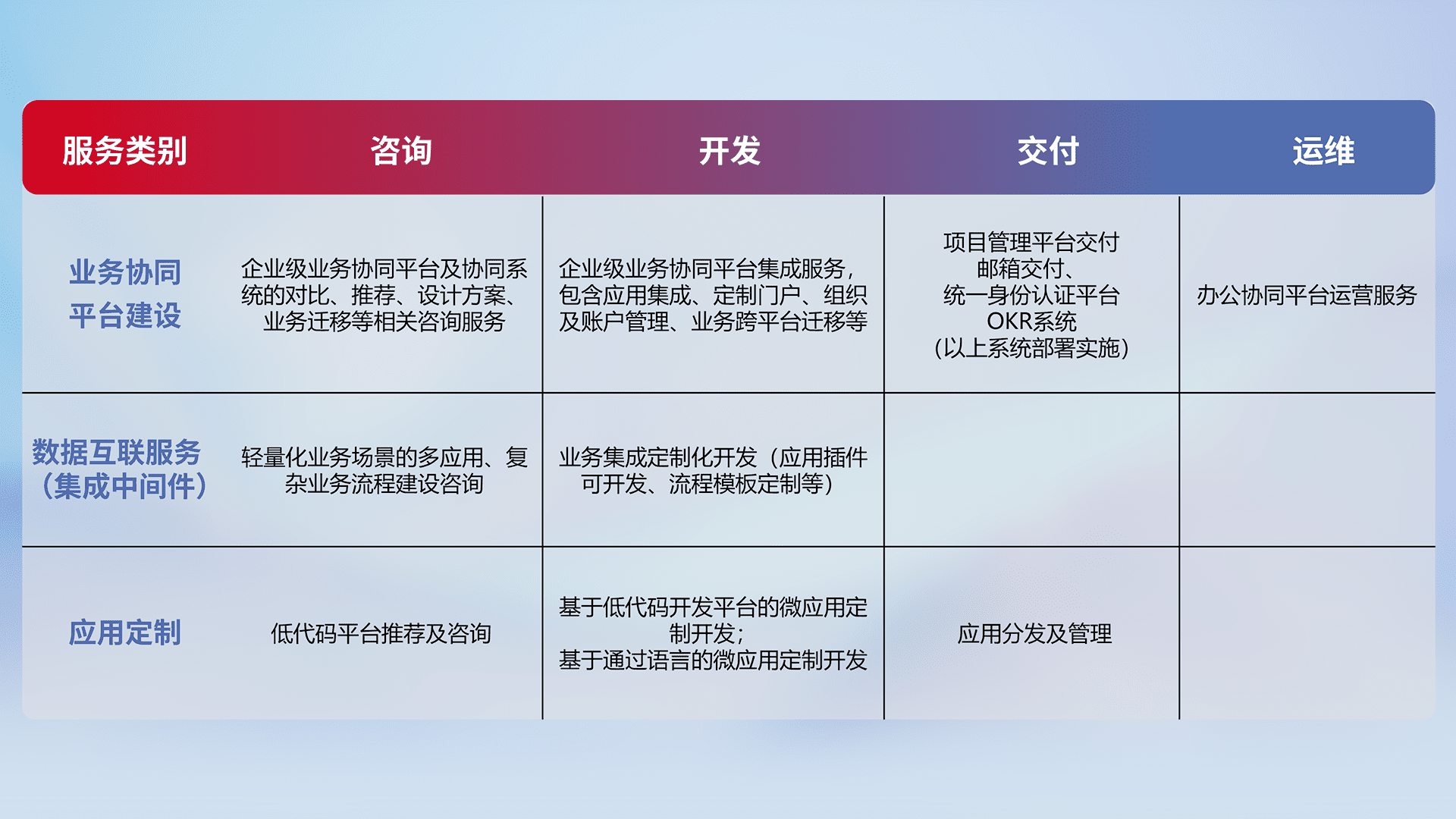 针对钉钉、、、企微、、、IDaas等平台级产品提供产品的规划、、方案、、交付、、定制化开发等服务,,,实现如统一协同办公、、、、智能客户服务、、、混合会议管理、、、、智能数据查询、、、、等业务场景,,,实现数字化转型。。